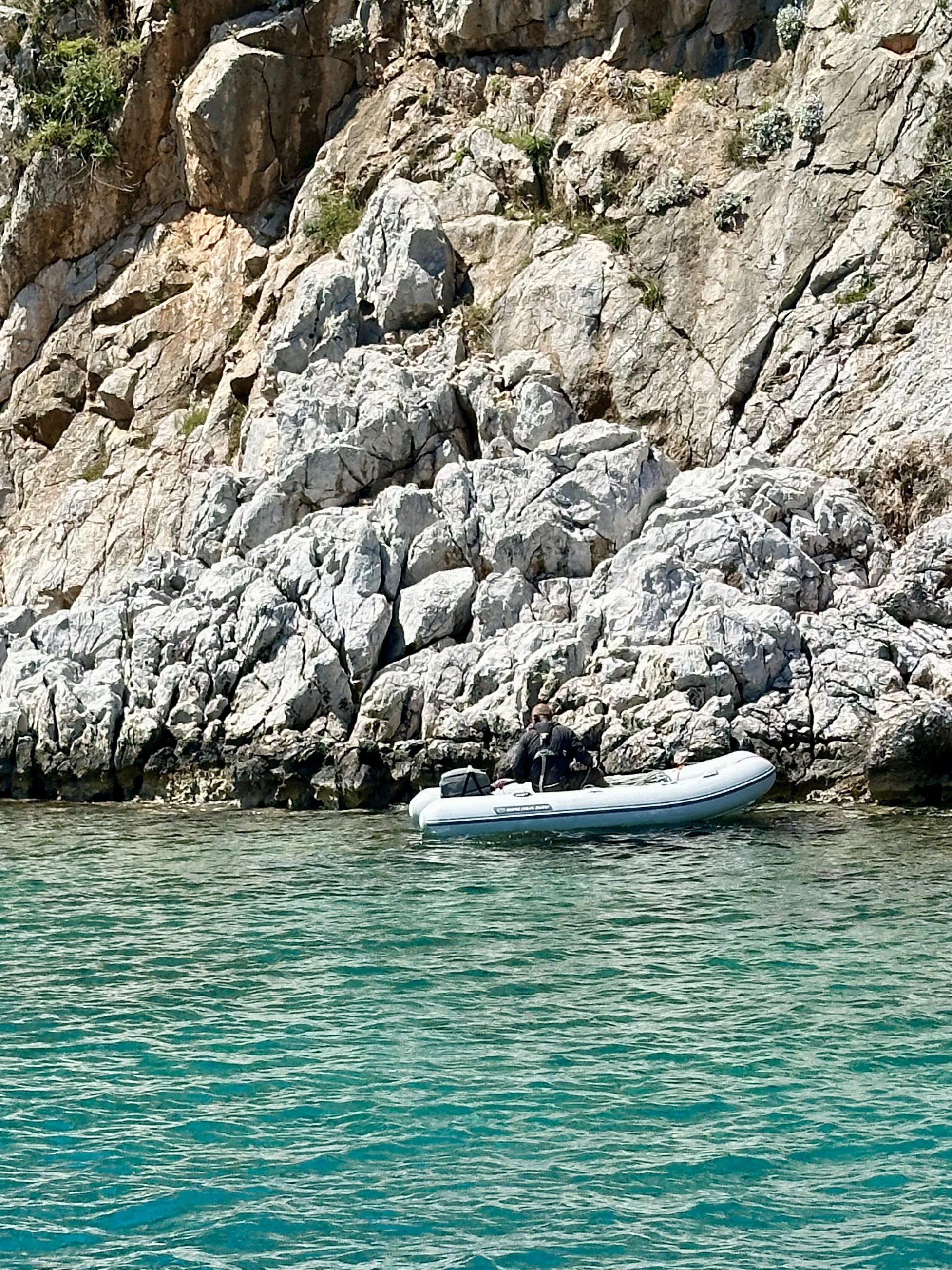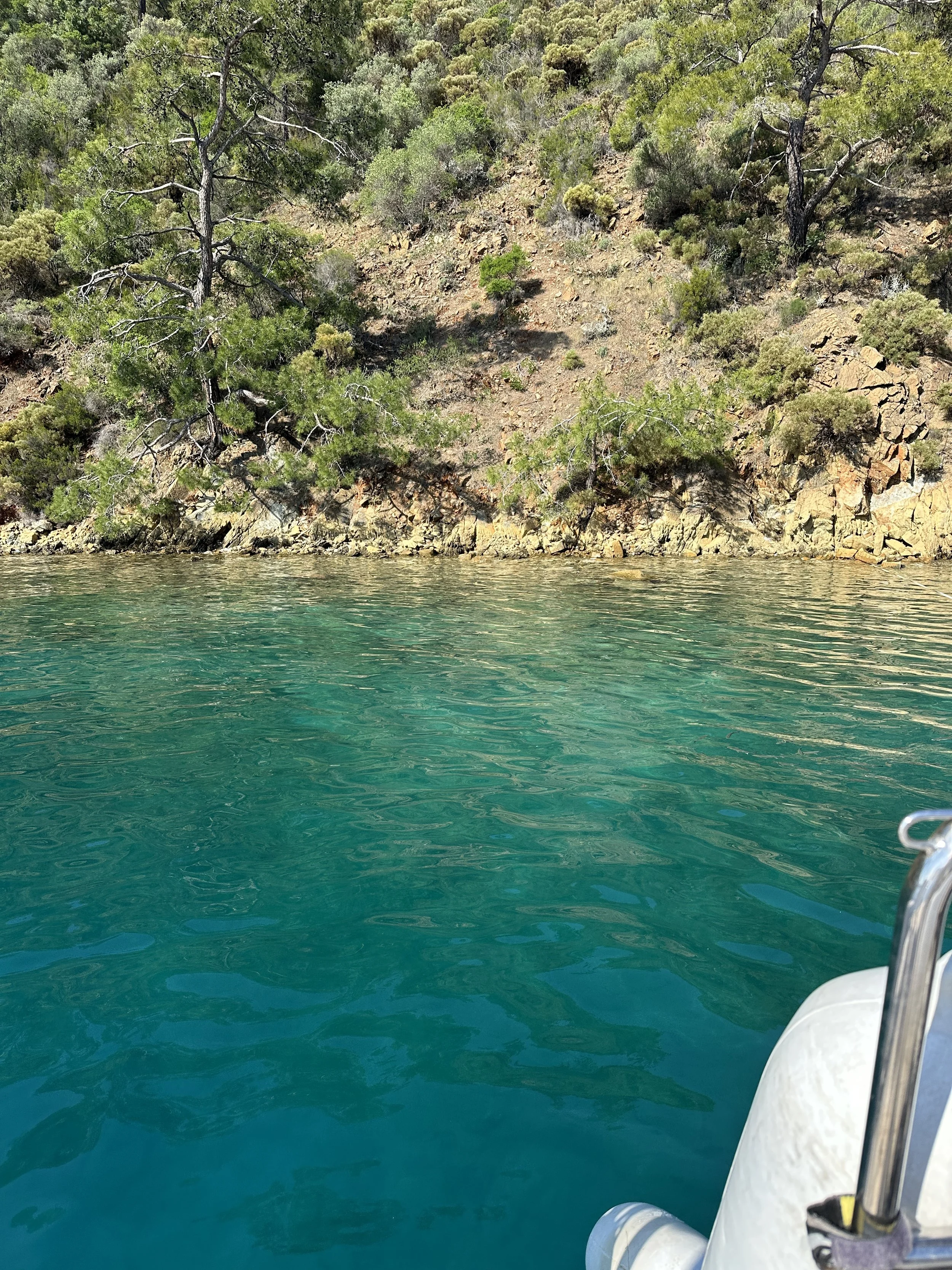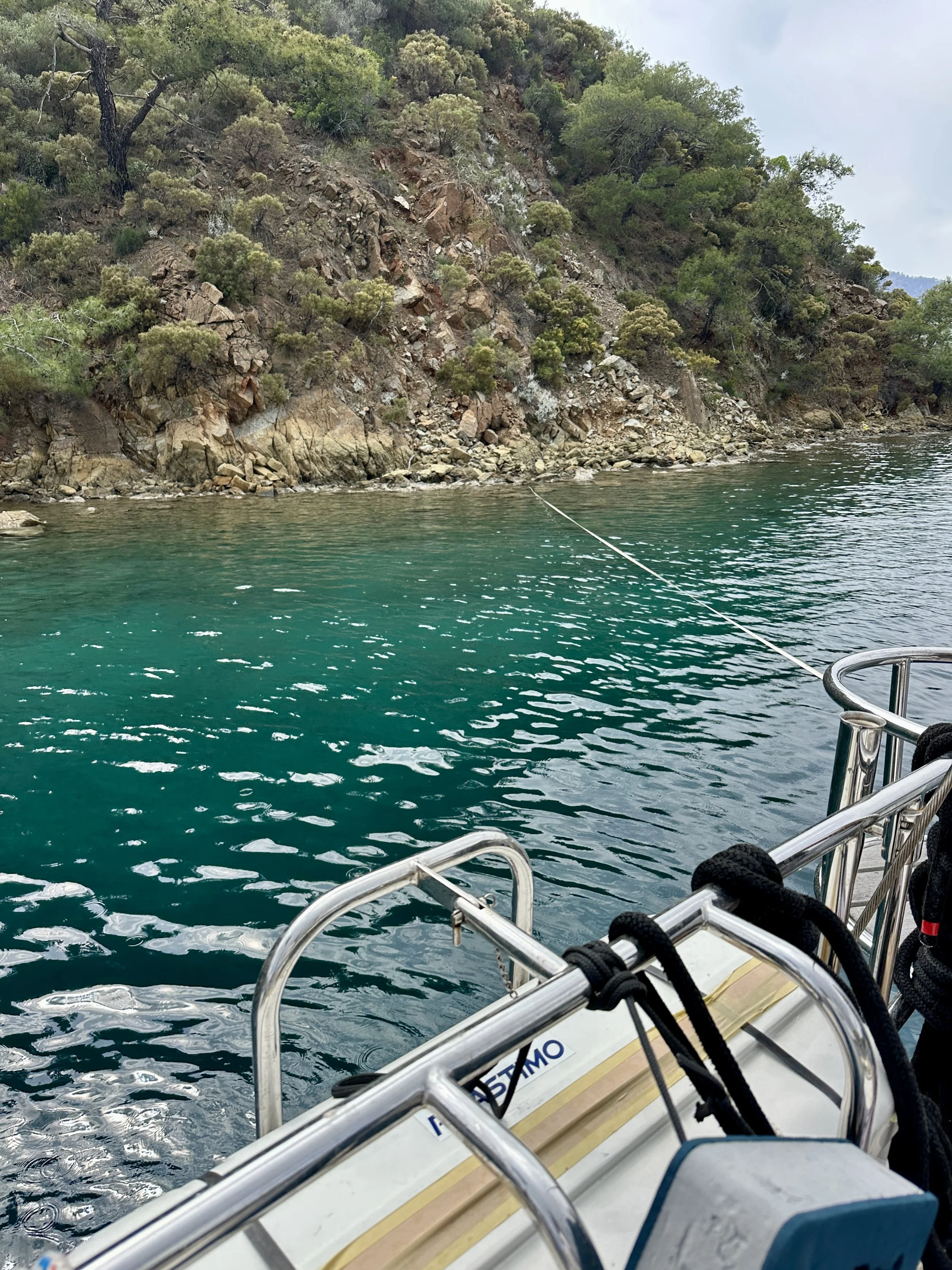 Gocek, a small town with six major marinas ($250+ per night for a 54’ slip) is an ideal location to practice our new stern to cliff anchoring skill, with miles of empty shoreline cliffs available before high season kicks in.